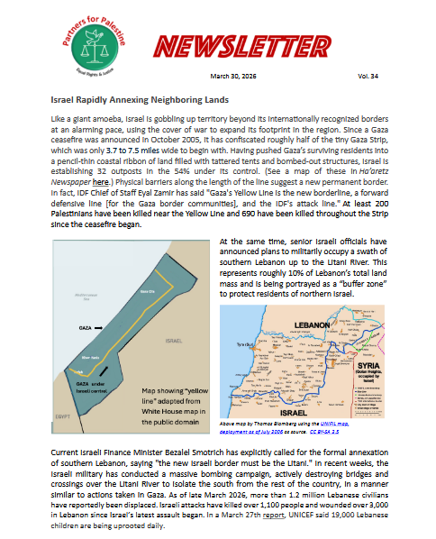 Partners for Palestine publishes a monthly newsletter with the latest updates. Find current and past issues on this page and click the Subscribe button to get them directly to your inbox.